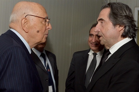 Il Presidente Giorgio Napolitano saluta il M° Riccardo Muti al termine della "Messa da Requiem" di G. Verdi dedicata alle vittime di tutte le guerre