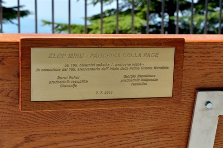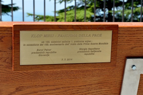 Il Presidente Giorgio Napolitano e il Presidente della Repubblica di Slovenia il Borut Pahor scoprono una targa commemorativa dell'incontro apposta su una panchina denominata "panchina della pace" a Monte Santo