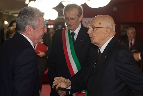 Il Presidente Giorgio Napolitano con il Presidente della Repubblica Federale di Germania Joachim Gauck al Teatro Regio al termine della sessione di apertura dell'Italian-German High Level Dialogue