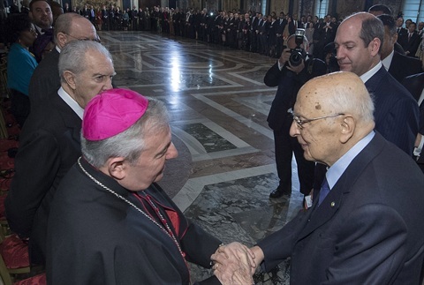 Il Presidente Giorgio Napolitano con S.E. Rev.ma Mons. Adriano Bernardini, Decano del Corpo Diplomatico - Nunzio Apostolico in occasione degli auguri di Natale e Capodanno da parte del Corpo Diplomatico,