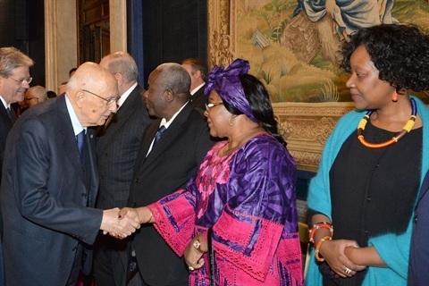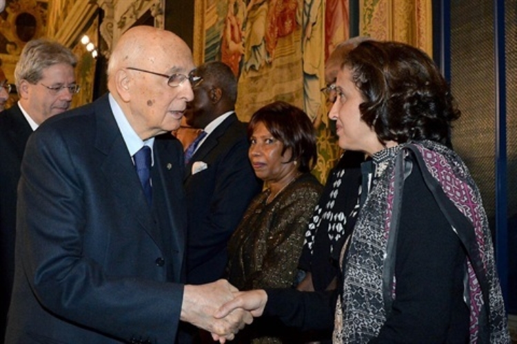Il Presidente della Repubblica Giorgio Napolitano con Tehmina Janjua, Ambasciatore della Repubblica Islamica del Pakistan in occasione degli auguri di Natale e Capodanno da parte del Corpo Diplomatico