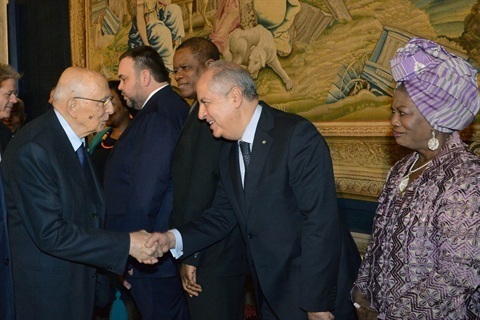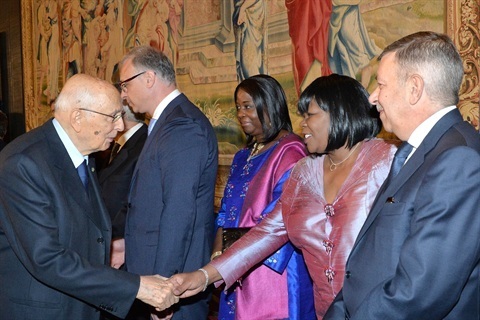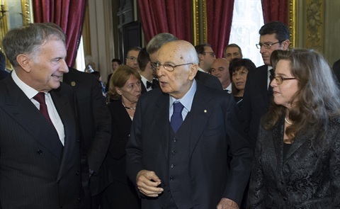 Il Presidente Giorgio Napolitano al termine del suo intervento saluta gli Ambasciatori del Corpo Diplomatico