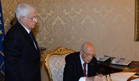 Il Presidente Giorgio Napolitano firma l'atto di dimissioni