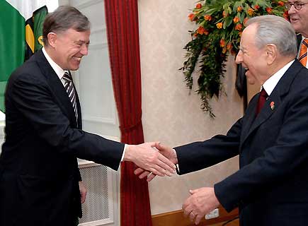 Il Presidente Ciampi accolto al suo arrivo dal Presidente della Repubblica Federale di Germania, Horst Kohler, alla sede dell'incontro tra i Capi di Stato firmatari dell'Articolo "Uniti per l'Europa.