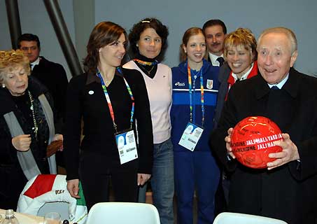 Il Presidente Ciampi, con la moglie Franca, durante la visita al Villaggio Olimpico scherza con Deborah Compagnoni, Isolde e Carolina Kostner e Manuela Di Centa.