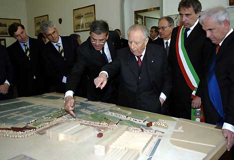 • Il Presidente Ciampi osserva il plastico del nuovo porto della città.