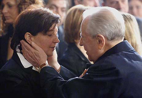 Il conforto del Presidente Ciampi alla Signora Teresa Greco, madre di Luca Polsinelli il giovane ucciso in Afghanistan, durante i solenni funerali nella Basilica di Santa Maria degli Angeli.