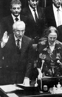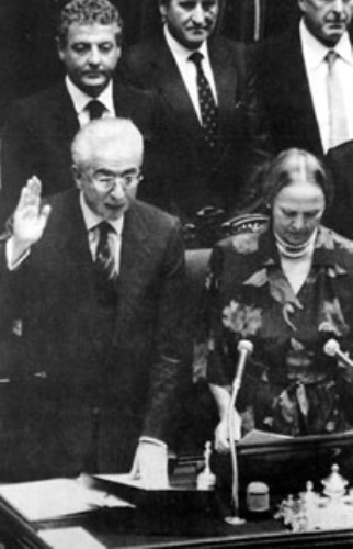 Il Presidente Cossiga a fianco di Nilde Jotti nel giorno di giuramento di fedeltà alla Costituzione. 3 luglio 1985