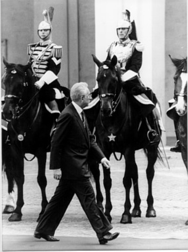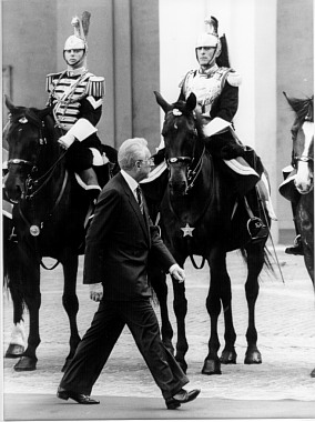 Il Presidente della Repubblica Francesco Cossiga passa in rassegna il reggimento d'onore dei Corazzieri al Quirinale