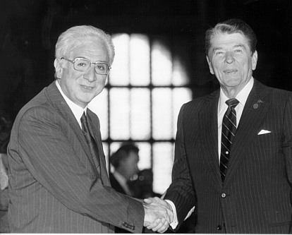 Il Presidente Cossiga con il Presidente Ronald Regan nel vertice economico di Venezia. 10 giugno 1987