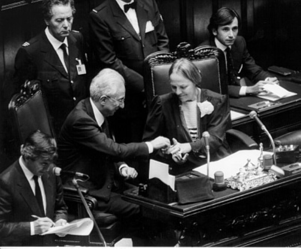 Il Presidente Cossiga con Nilde Jotti nel giorno di giuramento di fedeltà alla Costituzione. 3 luglio 1985