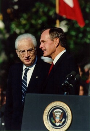 Il Presidente Cossiga con il Presidente George Bush in visita di Stato negli Stati Uniti. 11 ottobre 1989