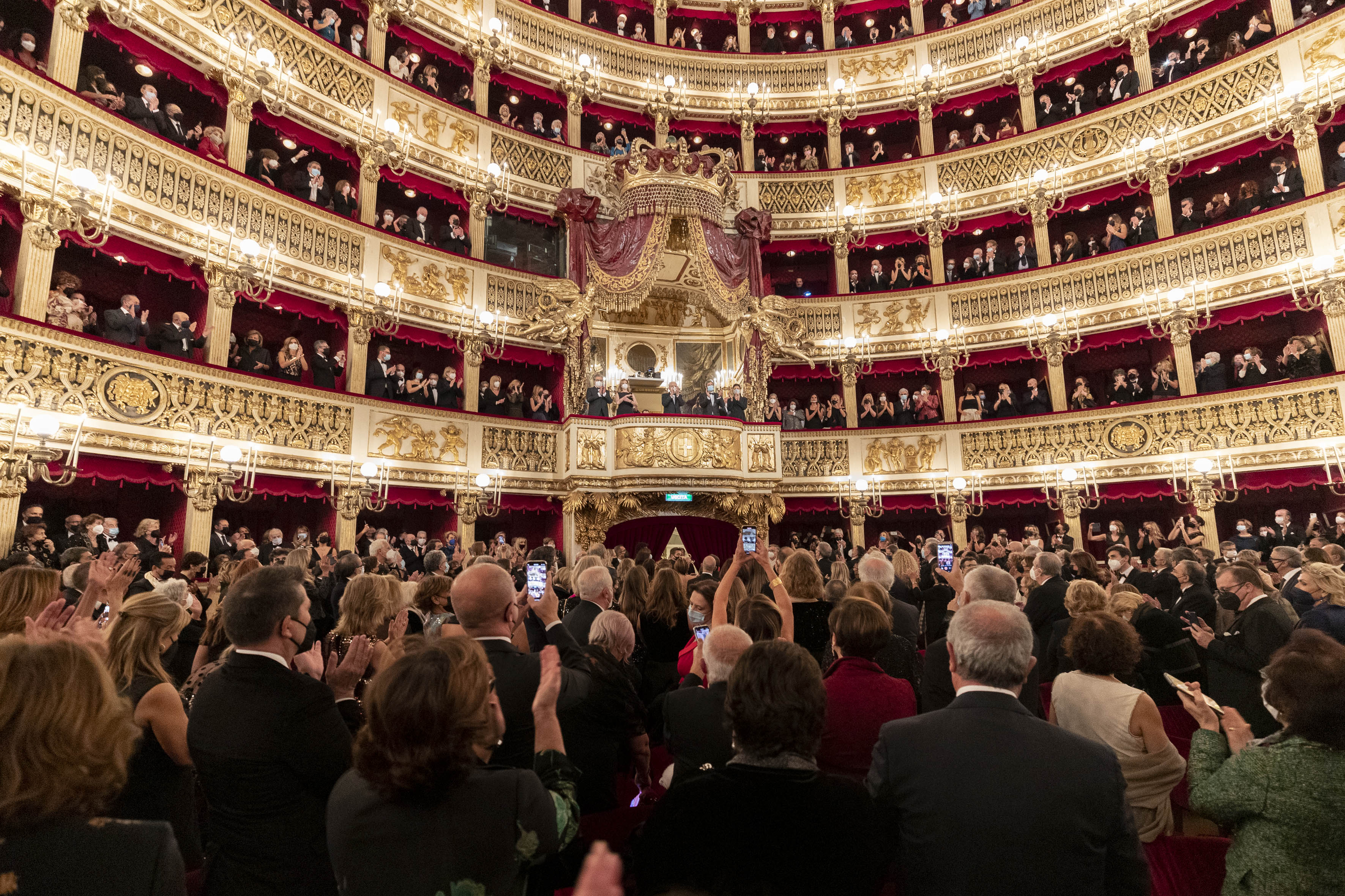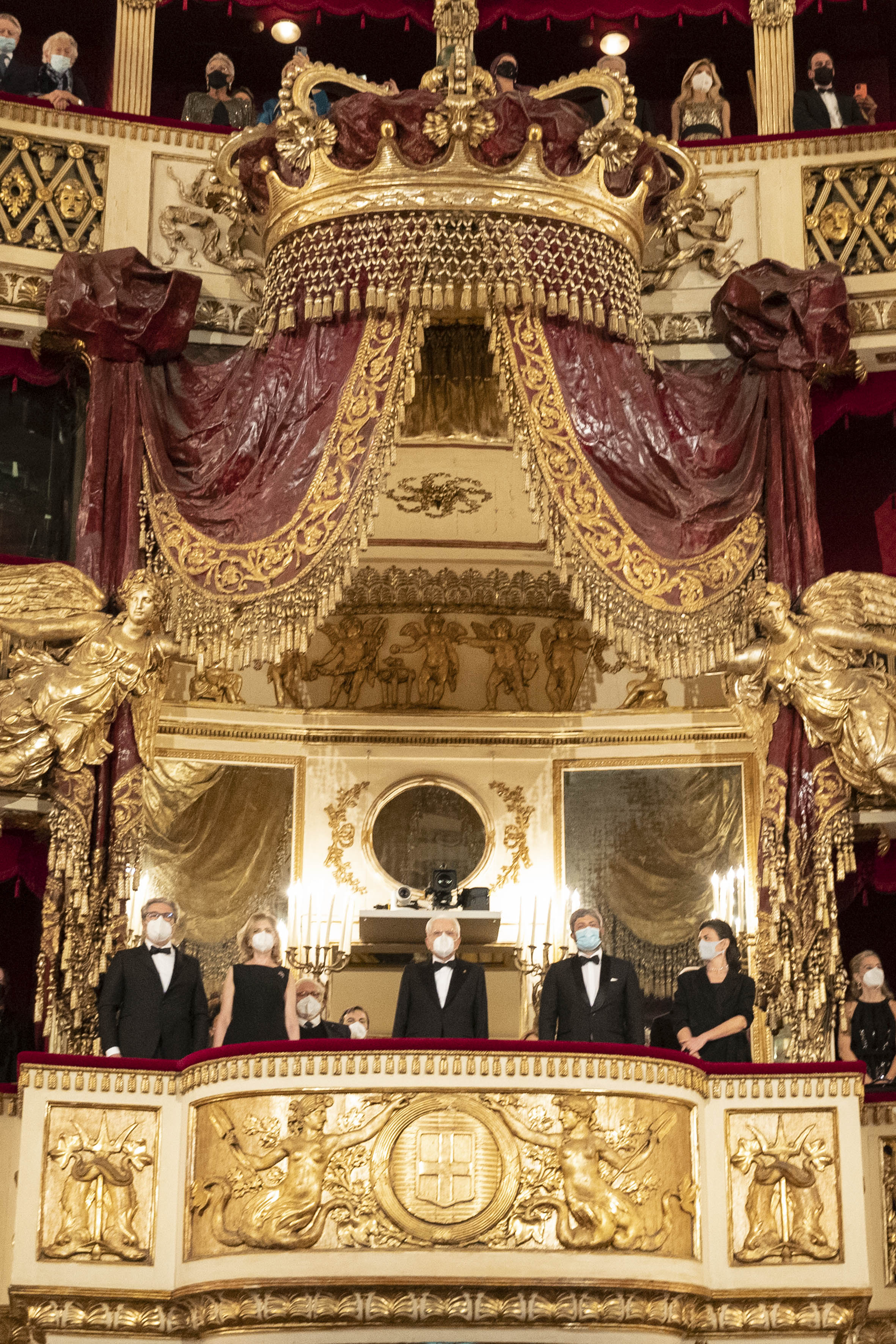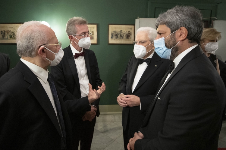 Il Presidente della Repubblica Sergio Mattarella al Teatro San Carlo di Napoli saluta Roberto Fico, Presidente della Camera dei Deputati,Vincenzo De Luca, Presidente della Regione Campania,e Gaetano Manfredi, Sindaco di Napoli.in occasione della rappresentazione dell'opera “Otello” di Giuseppe Verdi