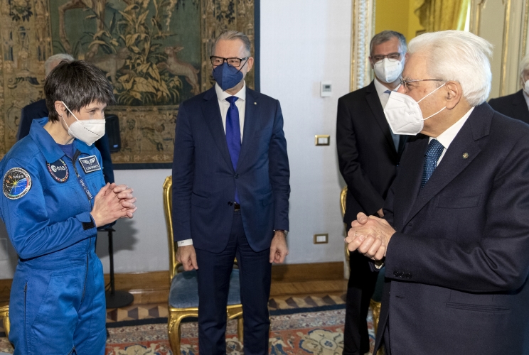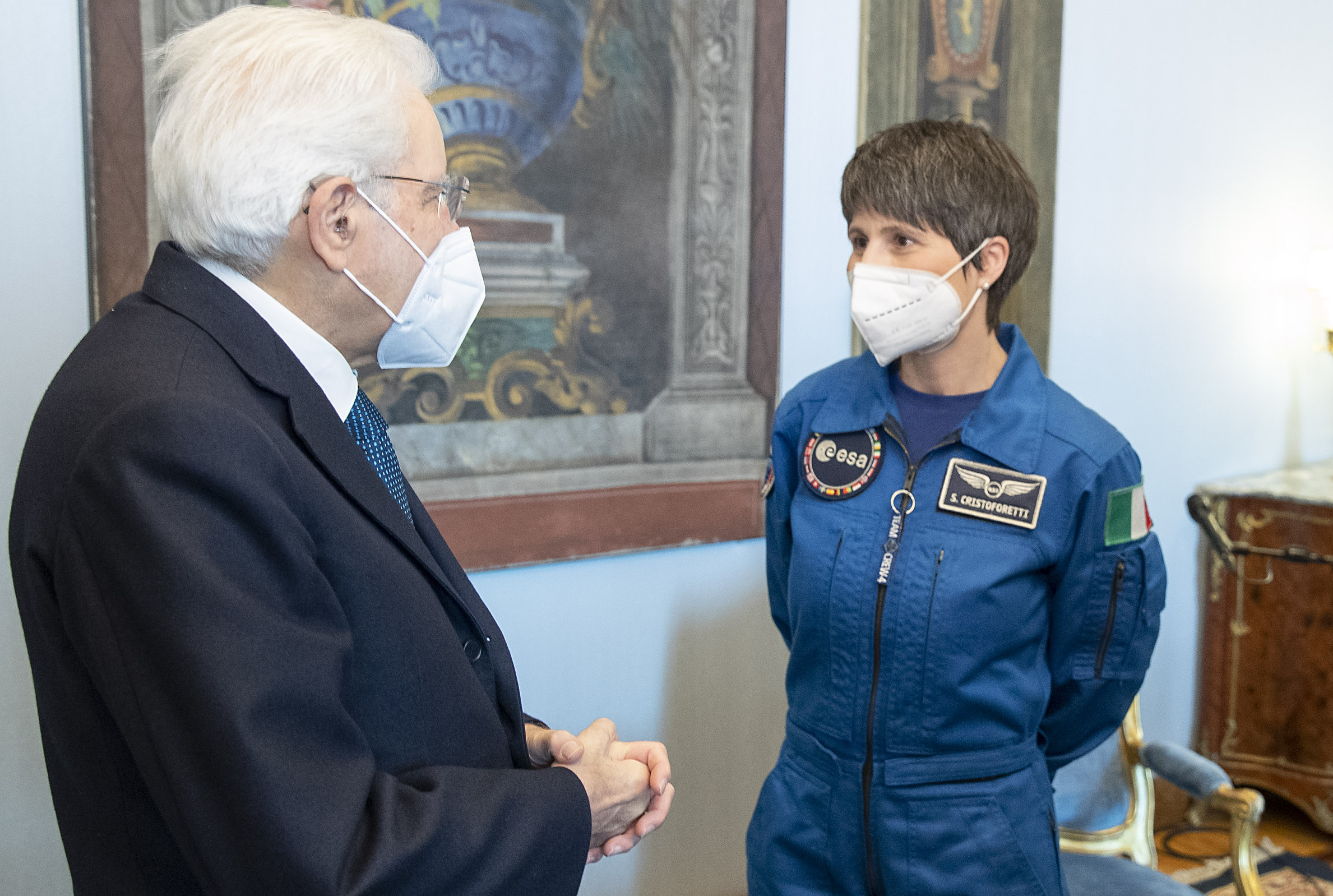 Il Presidente Sergio Mattarella con Samantha Cristoforetti, in partenza per la Stazione Spaziale Internazionale, Josef Aschbacher, Direttore Generale dell’Agenzia Spaziale Europea e Giorgio Saccoccia, Presidente dell’Agenzia Spaziale Italiana