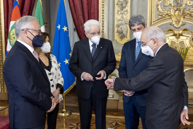 Il Presidente Sergio Mattarella con il Presidente del Senato Maria Elisabetta Alberti Casellati, il Presidente della Camera dei Deputati Roberto Fico e il Presidente f.f. della Corte Costituzionale Giuliano Amato al termine della cerimonia di giuramento del nuovo Giudice della Corte costituzionale, Filippo Patroni Griffi