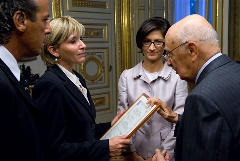 Al termine della cerimonia il Capo dello Stato ha consegnato, insieme al Ministro Gelmini, ai genitori di Vito Scafidi, studente del Liceo Darwin di Rivoli tragicamente scomparso nel crollo del soffitto della scuola, un diploma alla memoria.